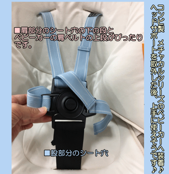 こちらのベビーカーとの相互性ですが、マットの肩ベルトの下の通し穴とベビーカーの肩ベルトの上の通し穴の位置がぴったりと合うようでした。